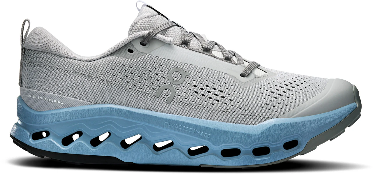 Englin’s Fine Footwear presents the mens ‘Cloudsurfer Trail 2’ from On Running. For a smooth effortless feel on trails. With more grip and a better fit. So you can relax and enjoy the scenery. It’s evolved. Our trail running shoe is built with computer-optimized CloudTec Phase® technology for a silky-smooth heel-to-toe transition. Now with improved stability for a soft, secure and effortless ride – whatever your adventure might bring. Hitting the trails you’ll need a tread you can trust. The Cloudsurfer Trail 2 features a Missiongrip™ rubber outsole plus updated lug geometry, for better grip and durability than ever before. We’ve adjusted the specs on your favorite trail running shoe for bigger, better comfort and a more inclusive fit. With lockdown lacing, a padded lining construction, and a breathable but abrasion-resistant upper to keep feet comfy.