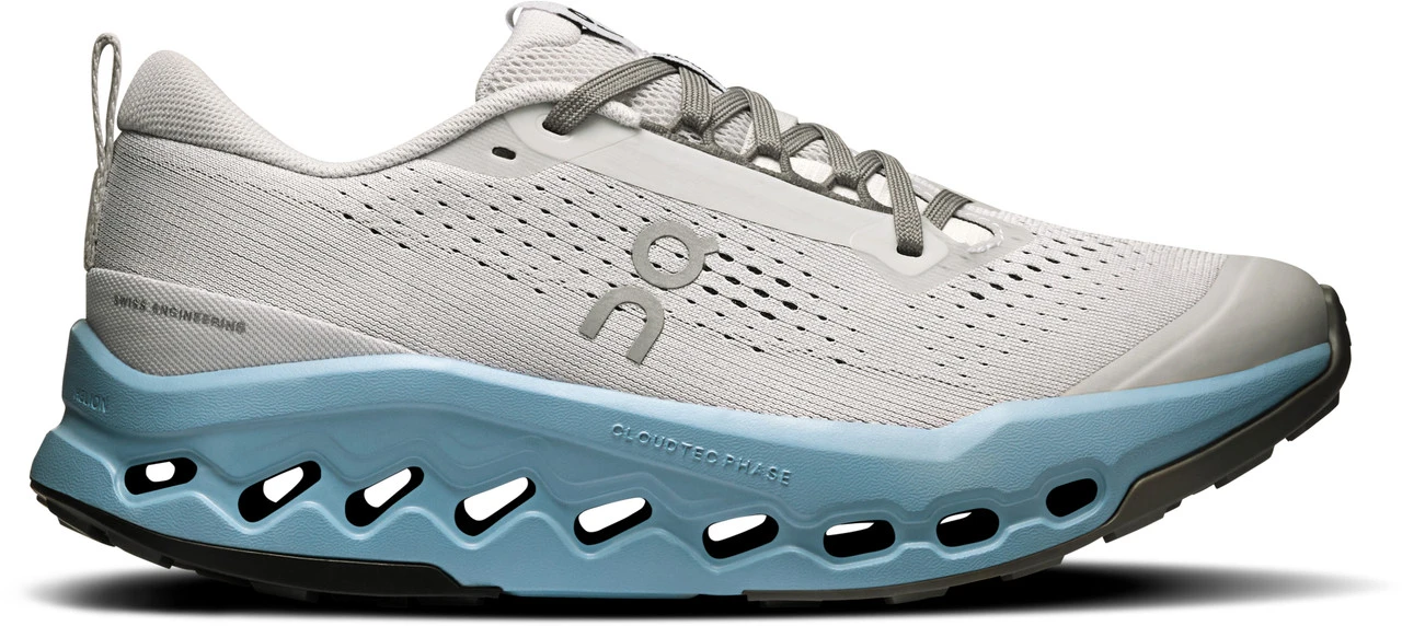 Englin’s Fine Footwear presents the womens ‘Cloudsurfer Trail 2’ from On Running. For a smooth effortless feel on trails. With more grip and a better fit. So you can relax and enjoy the scenery. It’s evolved. Our trail running shoe is built with computer-optimized CloudTec Phase® technology for a silky-smooth heel-to-toe transition. Now with improved stability for a soft, secure and effortless ride – whatever your adventure might bring. Hitting the trails you’ll need a tread you can trust. The Cloudsurfer Trail 2 features a Missiongrip™ rubber outsole plus updated lug geometry, for better grip and durability than ever before. We’ve adjusted the specs on your favorite trail running shoe for bigger, better comfort and a more inclusive fit. With lockdown lacing, a padded lining construction, and a breathable but abrasion-resistant upper to keep feet comfy.